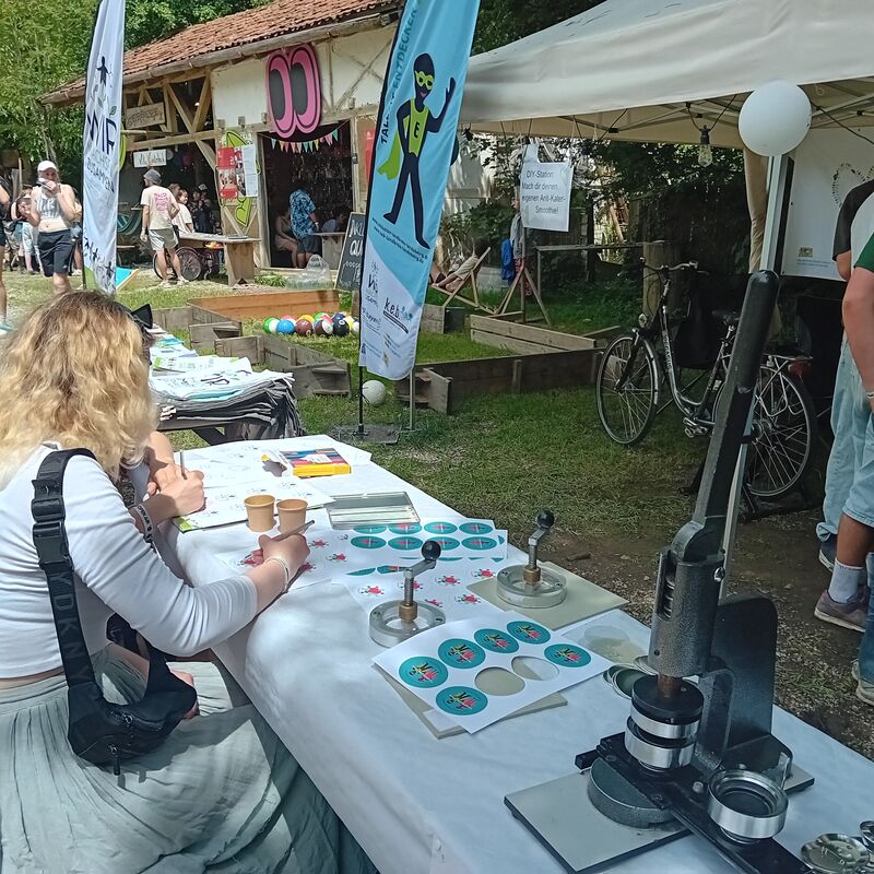 Die Besucherinnen und Besucher hatten die Möglichkeit, ihre Fähigkeiten beim Fußballbillard unter Beweis zu stellen, was sowohl sportliche Betätigung als auch Spaß garantierte. Ein weiteres Highlight war das Smoothie-Bike, bei dem man sich durch eigene Körperkraft einen gesunden Antikater-Smoothie erstrampeln konnte. Diese innovative Idee verband Bewegung und gesunde Ernährung auf spielerische Weise. Darüber hinaus konnte an der Buttonmaschine vorgefertigte Logokreationen ausgemalt oder bereits fertiggestellte Buttons gestaltet und so ein persönliches Souvenir des Festivals mit nach Hause nehmen.