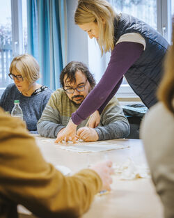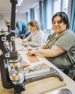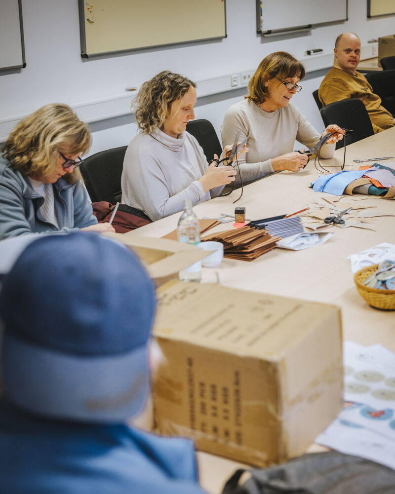 Ein besonderer Schwerpunkt lag diesmal auf der Vorbereitung von Bastelarbeiten für das Steinzeitdorf Pestenacker. Das Steinzeitdorf bietet 2026 wieder regelmäßig Mitmachprogramme für Schulklassen und Kindergartengruppen an, bei denen Kinder ihr selbst gefertigtes Werkstück mit nach Hause nehmen können. Dafür haben die Hilti Mitarbeitenden gemeinsam mit den Bewohnern der Ache verschiedenste Stoffe, Ausschneidematerialien und Bastelsets vorbereitet. In inklusiver, entspannter Zusammenarbeit werden somit die pädagogisch wertvollen Programme des Steinzeitdorfs nachhaltig unterstützt.