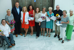 Zur Feierstunde gekommen waren auch Vertreter*innen des Seniorenbeirats, Sabine Zinser und Peter Draxlbauer, Brigitte Schlecht von der Koordinationsstelle bürgerschaftliches Engagement und Seniorenbeauftragte Barbara Juchem, daneben Kursbetreuerin Gudrun Ottmann und Leiterin des Mehrgenerationenhauses Betina Ahmadyar.